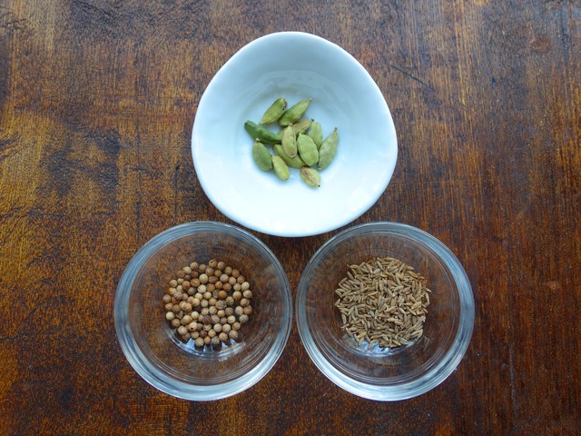 ホールのクミンとコリアンダーは、麺棒などですり潰して、香りを引き出します。