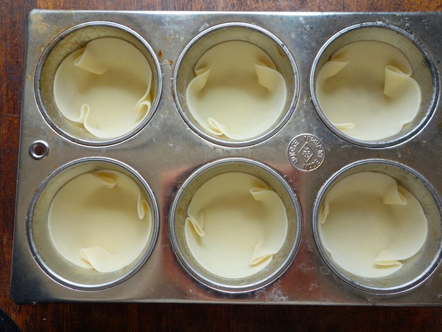 マフィン型に餃子の皮をしくときに、3か所に等間隔にしわを寄せるようにすると