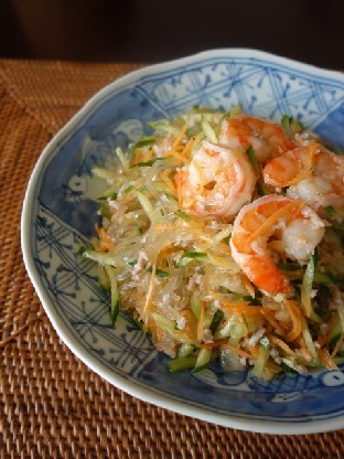 1 海老と挽肉をざるにいれ、火が通るまで茹でて水気を切る。春雨も茹でたら流水でぬめりを取り、水気を切り食べ易い大きさに切る。