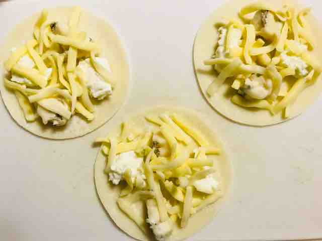 1 ゴルゴンゾーラとモッツァレラチーズを6等分し、餃子の皮1枚につき、それぞれ2かけずつのせたら、3等分したとろけるチーズを、それぞれにのせる。